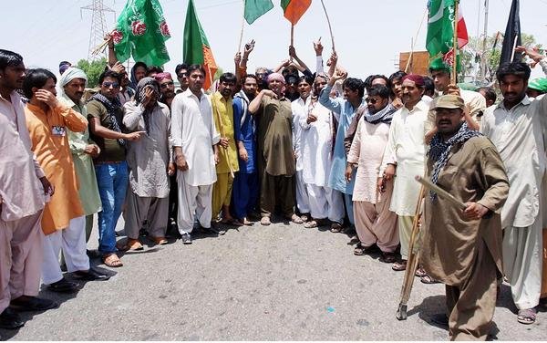 Px16-012 HYDERABAD: May16 – Activists of Pakistan Muslim League (F) stage a protest dharna on Hyderabad Bypass against alleged rigging in General Poll. ONLINE PHOTO by Nadeem Khawer